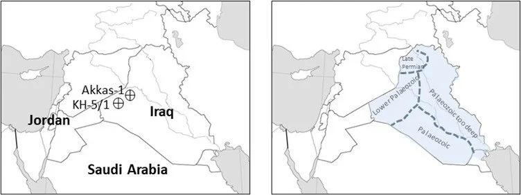 Fig. 1. KH-5/1 and Akkas-1 locations (after Stephenson et al. 2017) and the prospective Palaeozoic of Iraq, after Al-Hadidy, 2007