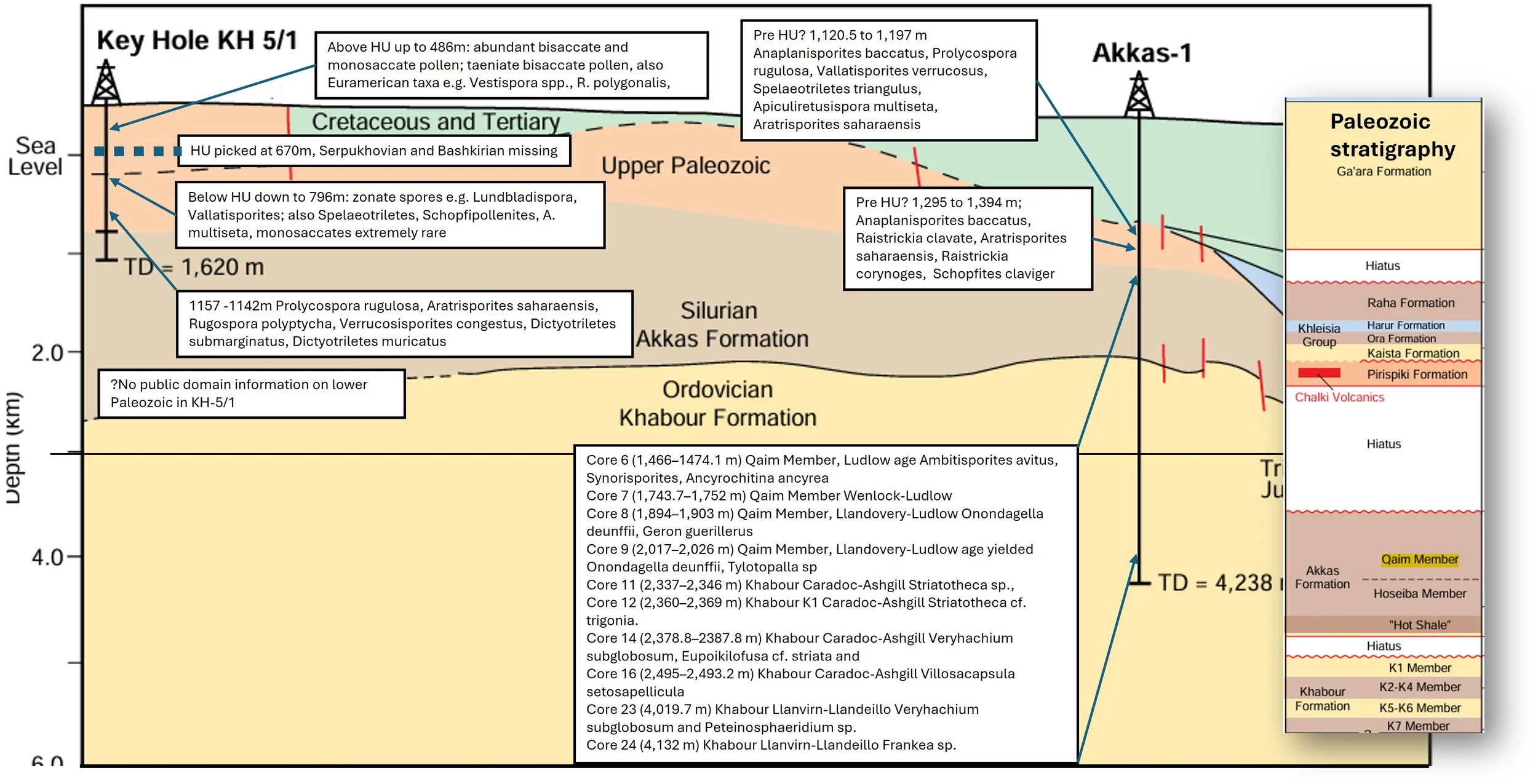 · The palynostratigraphy of Akkas-1 is from numerous cores offering high quality data down to 4132m within the Khabour Formation. Palynostratigraphy appears to suggest that the Hercynian unconformity is not present Akkas-1.